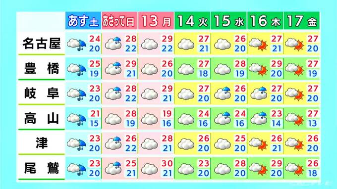 この先も曇りや雨の日が多くなるでしょう。3連休最終日の月曜日は、名古屋や岐阜で真夏日に迫る暑さになる予想です。引き続き、一日の寒暖差にご注意ください。3連休は最新の台風情報をご確認ください。