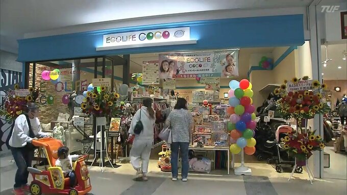 「エコライフココ」は、着られなくなった子ども服や使わなくなった子ども用品を店頭で買取・販売するリユースショップで、全国35か所に展開しています。県内で初めてオープンした「イオンモールいわき小名浜店」は、TUFのグループ会社が県内の子育て環境を充実させようとフランチャイズ運営しています。