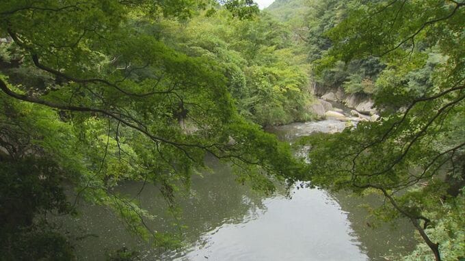 JR伯備線生山駅付近にある渓谷、石霞渓(せっかけい)に到着です。奥日野県立自然公園に含まれ、生山駅付近を中心に南北およそ2kmに広がる大渓谷で、渓谷に沿って、山肌が屏風のように連なります。