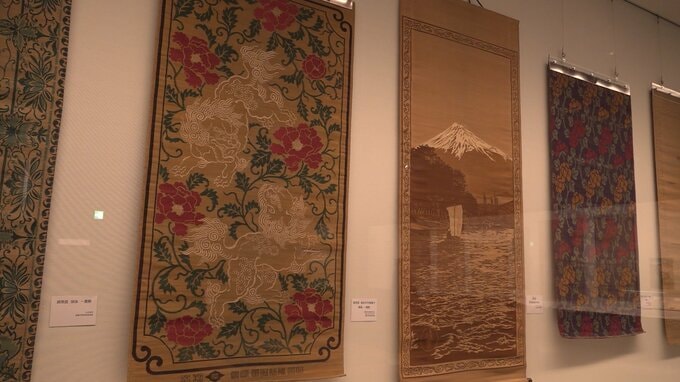い草を細かく織り込んで作られた色鮮やかな「花ござ」が並びます。岡山県立博物館できょう(10日)始まった特別展「花ござ 心おどる い草の世界」です。