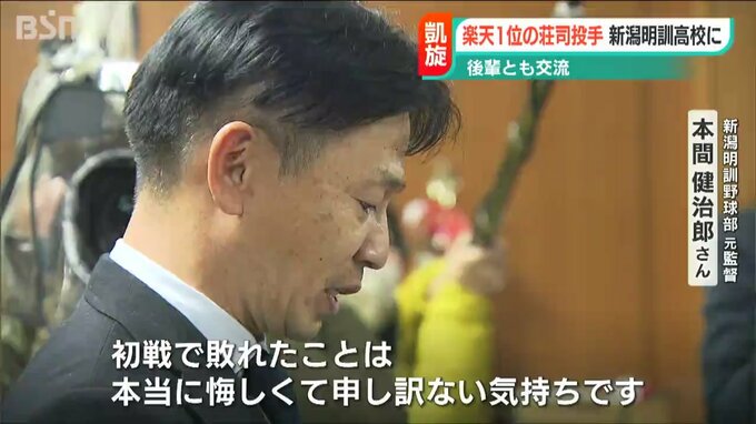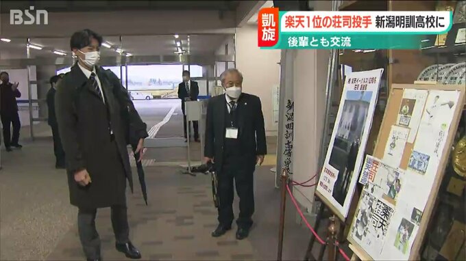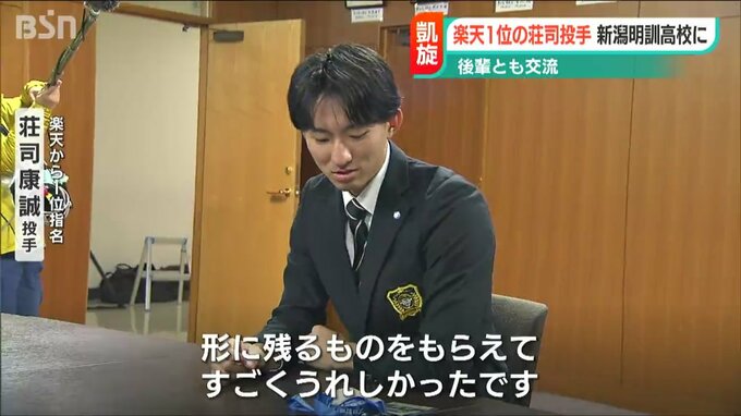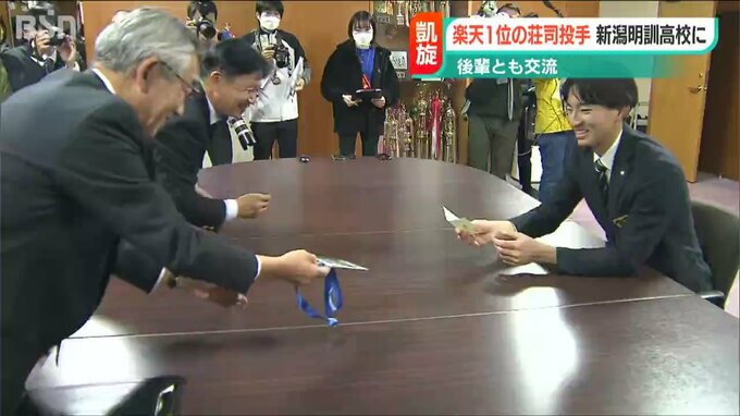 母校・新潟明訓高校を訪れた立教大学の荘司康誠投手。学校長と野球部の前監督と懇談し、ドラフト会議で、楽天が引き当てたくじを示しながら、楽天の1位指名を報告しました。