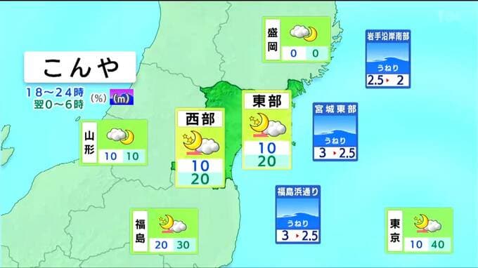 寒気や気圧の谷の影響で雲に覆われるでしょう。夜は弱い雨の降る可能性があります。