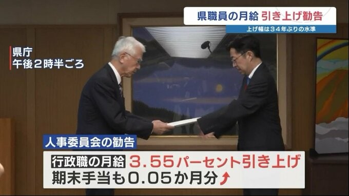 県の人事委員会の勧告では、行政職員などの月給を3.55%引き上げ、ボーナスにあたる期末手当も0.05か月分引き上げるように求めました。