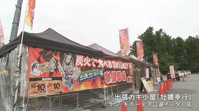 ドン・キホーテ河口湖インター店の屋外特設会場に10日、出張カキ小屋がオープンしました。