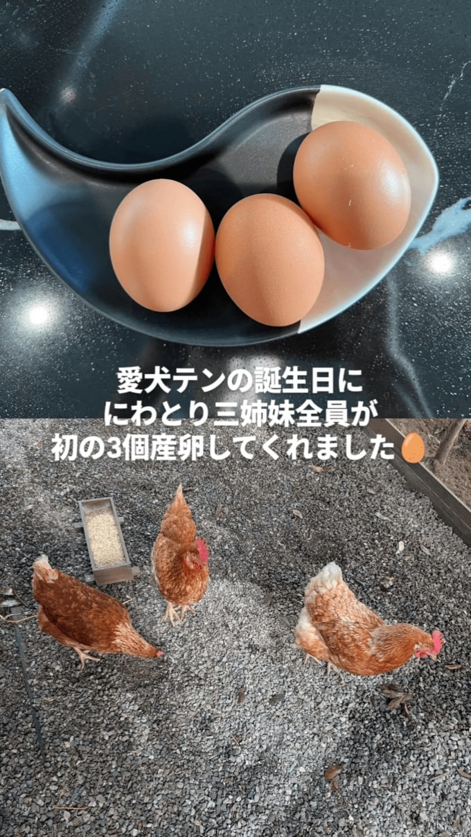 照英さんは、自身のインスタグラムのストーリーズ機能で、3つの卵とニワトリ三姉妹の写真を投稿。「愛犬テンの誕生日に にわとり三姉妹全員が初の3個産卵してくれました」とコメントを添え、二重の喜びに沸く様子を伝えています。