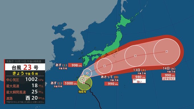 気象庁によりますと、台風第23号は、きょう(10日)午後6時には南大東島の北約160kmを時速20kmの速さで西へ進んでいます。