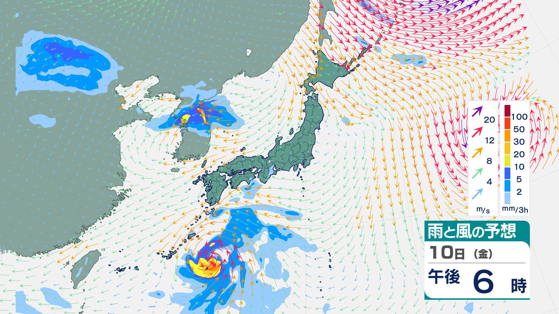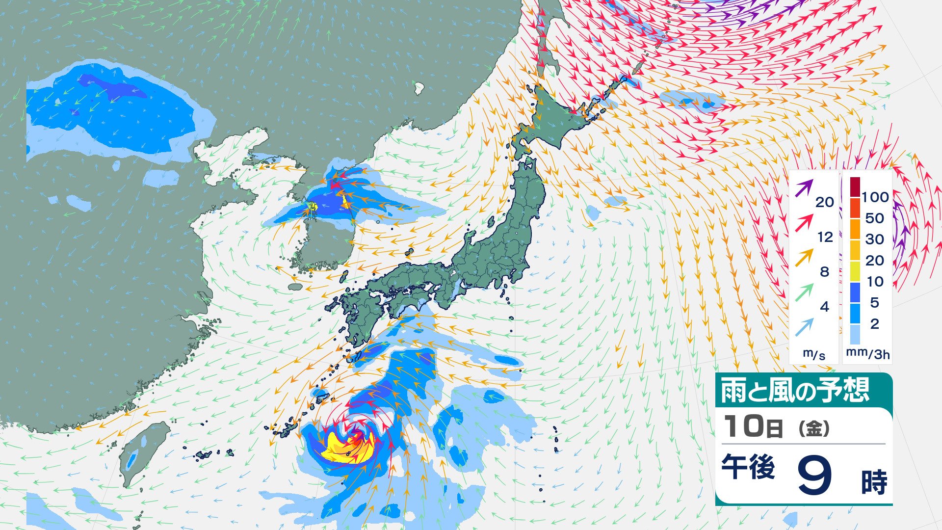 【台風情報】3連休の天気はどうなる?「台風23号」沖縄・奄美・九州南部は注意を 10日(金)~13日(月)にかけ日本列島沿岸部を西から東へ進む予測 今後の進路は? 気象予報士が詳しく解説【気象庁 10日午後4時30分更新】 RSK山陽放送 2025年10月10日(金) 16:30 国内 10日(金)雨と風のシミレーション 10日(金)の3時間ごとの雨と風のシュミレーションは【画像⑯~⑰】の通りです。 【画像⑯】 【画像⑰】
