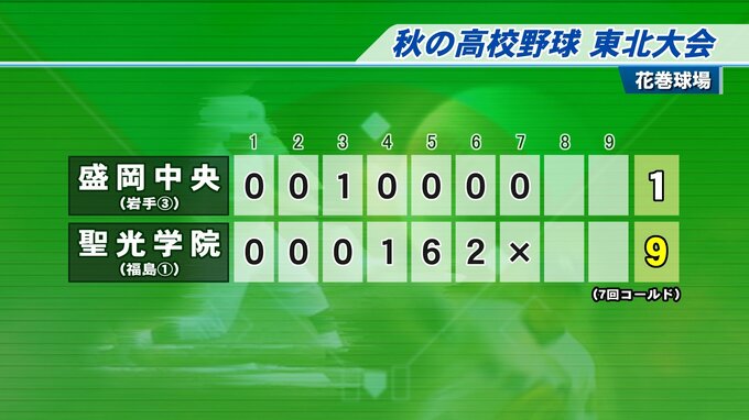 一方、盛岡中央は花巻球場での第1試合で福島第1代表の聖光学院と対戦し、7回コールド9対1で敗れました。
