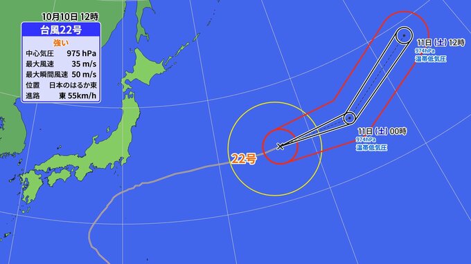 4日(土)にフィリピンの東海上で発生した台風22号は、9日(木)の明け方~朝にかけて「非常に強い勢力」で伊豆諸島に接近しました。10日(金)正午時点では日本のはるか東海上へ離れていて、11日(土)には温帯低気圧に変わる見込みです。