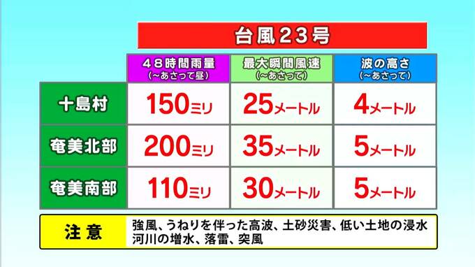 では、気象台から発表されている情報です。まずは奄美地方。奄美北部が最も荒れそうです。奄美地方の10月、ひと月分の雨量は200ミリぐらいなので、1月分の雨が1日程度で降ってしまう可能性があります。