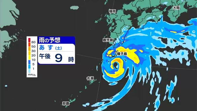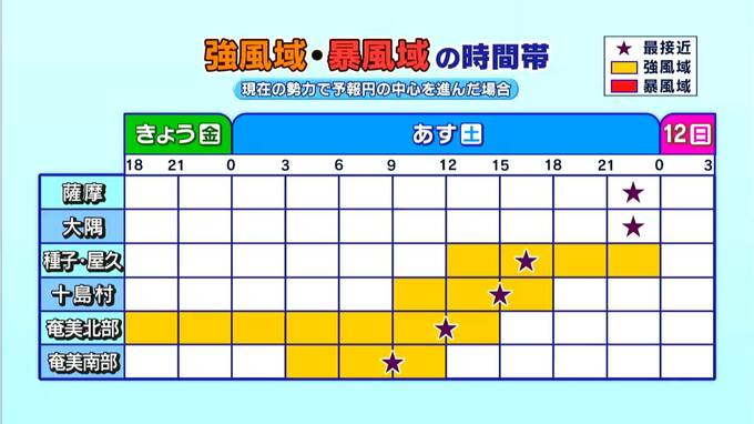 では、現在の勢力で予報円の中心を進んだ場合、奄美北部は10日夜から強風域に入り、そして台風の移動に伴い、十島村は11日昼前から種子島・屋久島は11日昼過ぎに強風域に入る見込みです。