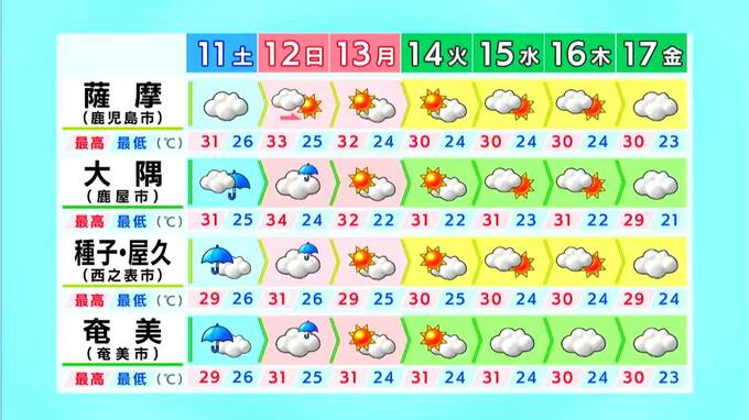では、続いて薩摩、大隅。種子島・屋久島地方、台風本体の雨雲がかかる種子島・屋久島では、250ミリの雨が予想されていて、11日の夕方から局地的に激しい雨が降りそうです。台風から離れている薩摩地方は大雨の心配はないでしょう。
