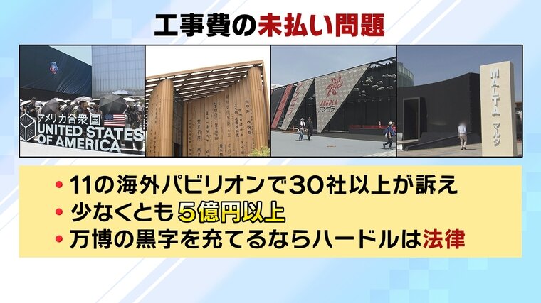 工事費については、11の海外パビリオンで30以上の建設業者が未払いを訴えていて、中には裁判に発展しているケースも。裁判の損害賠償の請求額などから見ると、未払いの金額は少なくとも5億円以上にのぼっているとみられます。
