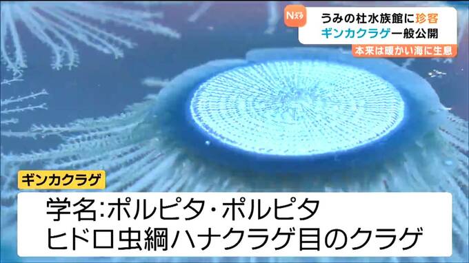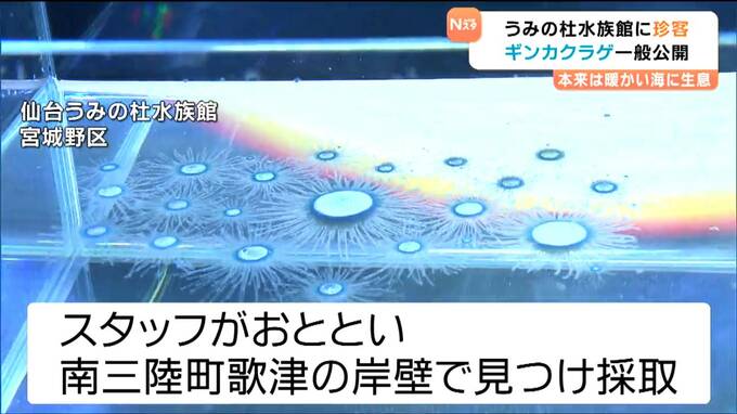 銀色の円盤。青い触手のようなもの。水面に漂うなんとも不思議な生きものこれが「ギンカクラゲ」です。10月8日、仙台うみの杜水族館のスタッフが南三陸町歌津の岸壁で見つけ採取しました。
