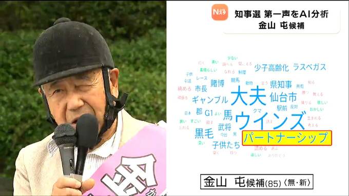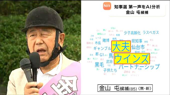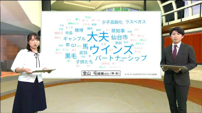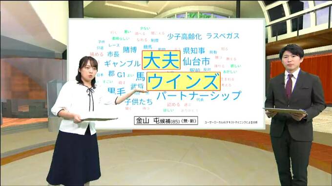 宮城県庁のすぐそばで約12分間の第一声を行った金山さん。場外馬券売場の誘致が少子高齢化の対策になると訴えました。