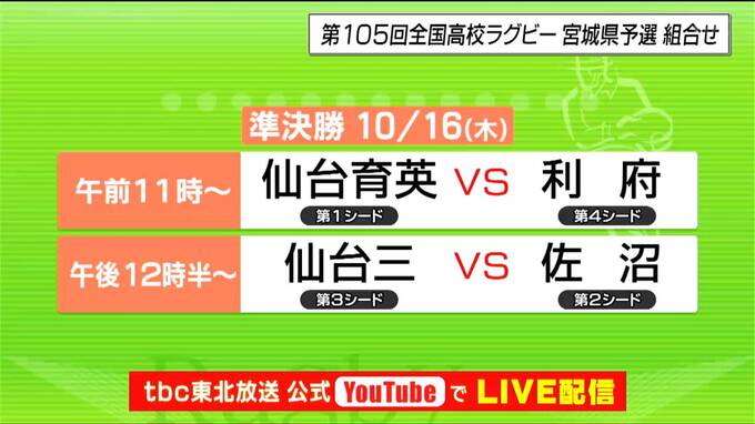 高校生ラガーマンが花園を目指し戦う高校ラグビー大会宮城県予選。10月13日週の木曜に行われる準決勝へ大会30連覇を狙う仙台育英が臨みます!