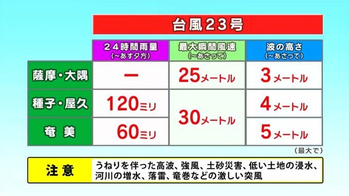 種子島・屋久島では、11日夕方までに多いところで120ミリ、最大瞬間風速は30メートル、海上は4メートルから5メートルのしけが予想されています。