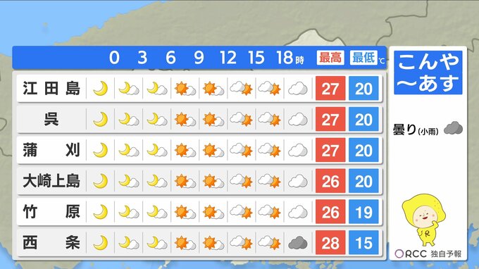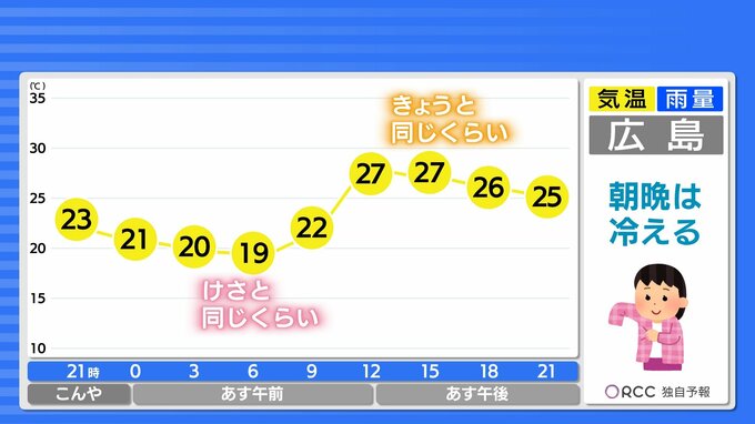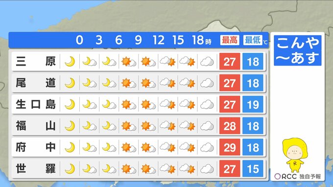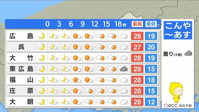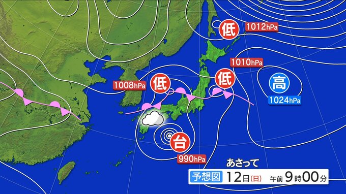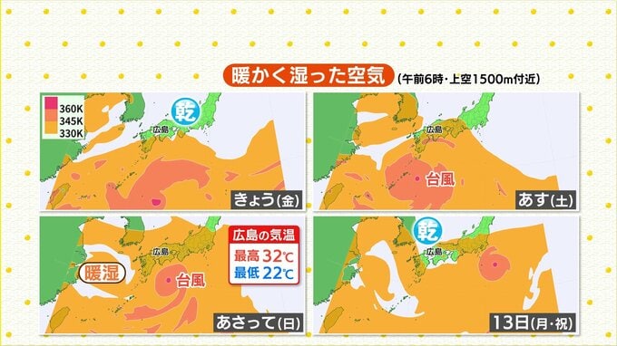あさって12日(日)は、台風が四国の南海上まで北上し、日本海には前線が伸びる見込みです。県内には湿った空気が入りやすく、雲が多い天気となるでしょう。台風由来の暖かい空気が流れ込むため、気温が高くなる予想です。広島市中区の最低気温は22℃、最高気温は32℃となり、きょうよりも4℃ずつ高い見込みです。
