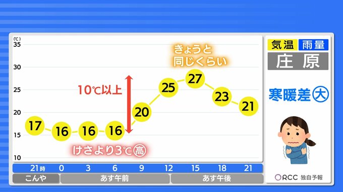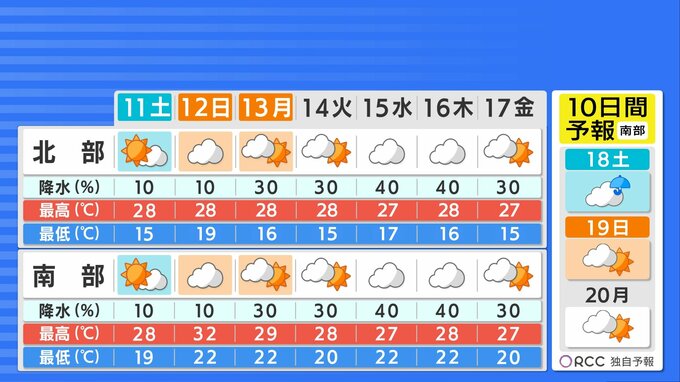 あす11日(土)は、高気圧の圏内で午前中ほど日差しが届きますが、南から湿った空気が入りやすく、午後から雲が増えるでしょう。夜には雲が厚くなり、にわか雨が降るところもある見込みです。日中の気温は、きょうと同じくらいか、やや高いところがある予想です。最低気温は、内陸や北部ではけさよりやや高くなりますが、それでも1日の気温差が大きいのでご注意ください。