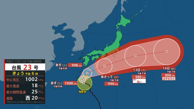 台風23号は、午後3時現在、南大東島の北約160kmを時速20kmの速さで西へ進んでいます。あす11日には、奄美地方に接近する見込みで、あさってにかけて四国の南海上を通る見込みです。県内への直接の影響はない見込みですが、最新の情報を確認するようにしてください。ただ、間接的な影響として、暖かく湿った空気が入るため、この週末は気温が高くなる予想です。
