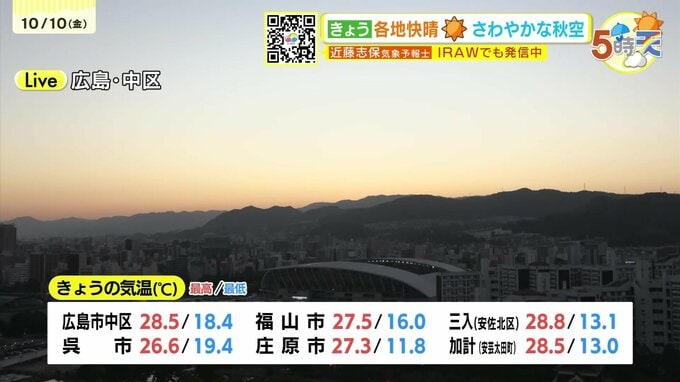 きょう10日(金)の広島県内は、雲も少ないカラッとした秋晴れとなりました。最高気温は、安佐北区三入で28.8℃、広島市中区と安芸太田町加計で28.5℃、各地平年よりもかなり高くなりましたが、空気が乾燥しているので、心地よい陽気となりました。