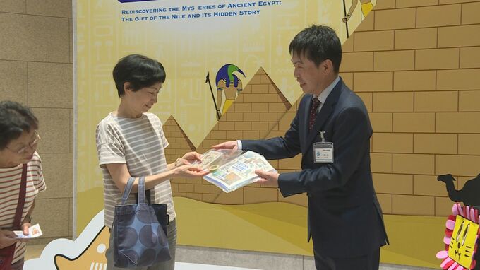 1万人目となったのは、福岡県小郡市の合原紀子さんです。下関市立美術館の桝谷範一館長から図録やポストカードなどが手渡されました。家族全員エジプトが好きで、旅行にも行ったことがあるという合原さん。新聞の広告を見て、家族4人で来場しました。