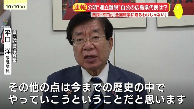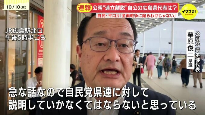 「びっくりした。(連立を)出ることはないだろう、どこかで折り合うだろうと思っていた。それもできないということであれば、困ったなと。(斉藤代表の会見では自公が)全面戦争に陥るわけではないということで、折り合えない点は1点から2点だろうと思うが、(政治とカネについて公明党は)やはり妥協できないということだろう。その他の点は、今までの歴史の中でやっていこうじゃないかということだと思う。(それは広島に関しても?)そうですね」