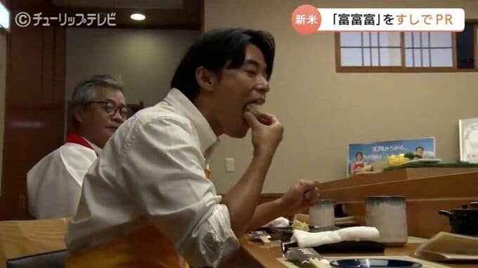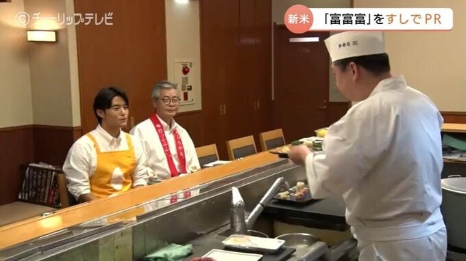 10日は富山市内の寿司店でキックオフセレモニーが開かれ、「富富富」ナビゲーターを務める県出身の俳優・池田航さんがベニズワイガニ・ガンドブリ・シロエビの握りを味わいました。