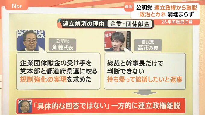 連立解消のポイントとなったのが、「企業・団体献金」です。
