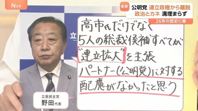 「高市氏だけではなく、5人の総裁候補全てが“連立拡大”を主張しているパートナー(公明党)に対する配慮がなかったと思う。(公明党の)立ち位置に共通点があると思う。どんな連携ができるか状況を見ながら協議をしていきたい」