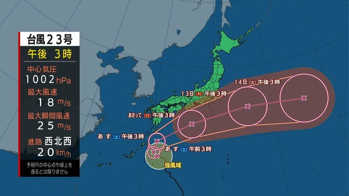 きょう10日(金)は沖縄・大東島地方に接近していて、あす11日(土)奄美地方に近づく予想です。あさって12日(日)には急激に進路を東寄りに変えて、赤色の暴風域を伴いながら、台風22号と同じように伊豆諸島にかなり接近するおそれがあります。伊豆諸島では、台風22号の記録的な大雨、暴風、高波の影響で災害の危険度が高まりやすくなっている地域があります。台風22号の被害で大変な状況かと思いますが、どうか、12日(日)の昼間までに、台風23号への備え、そして安全の確保をお願いします。