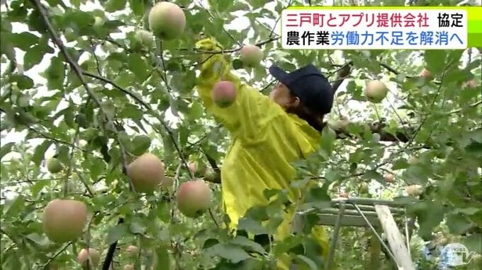 青森県三戸町は、農作業に当たる労働力不足を解消しようと短時間のアルバイトを募集・応募できるスマートフォンのアプリを提供する企業と協定を結び、10日は採用された人がリンゴ園で勤務を行いました。中澤美寿妃…