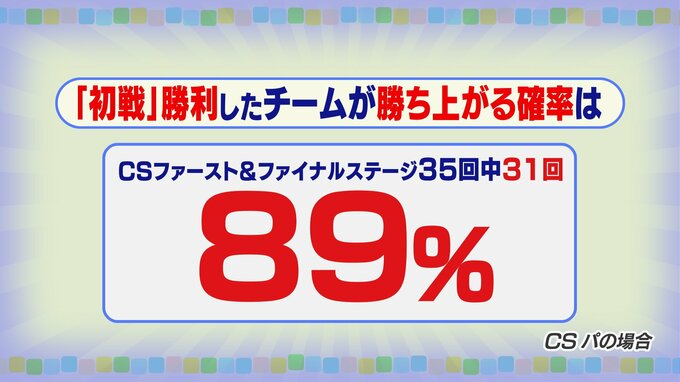 CSは「初戦がカギを握る」といっても過言ではない。「CS」としてスタートした2007年以降、パ・リーグではファースト&ファイナルステージあわせて初戦をとったチームが勝ち上がった確率は、なんと89パーセントにものぼる(35回中31回)、およそ9割という高確率で初戦をとったチームが次のステージに進んでいる。
