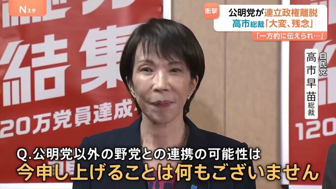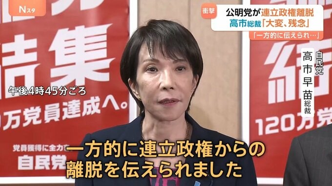 公明党が、連立政権からの離脱を自民党・高市総裁に伝え、その後、高市総裁は記者会見を行いました。