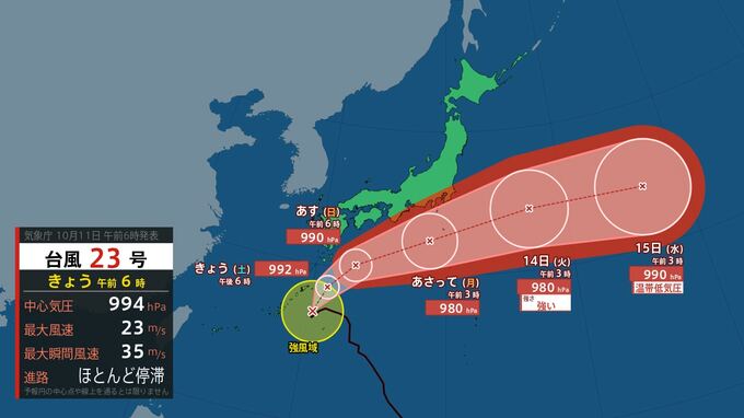 気象庁によりますと、台風第23号は、きょう(11日)午前6時には奄美大島の南南東約180キロにあって、ほとんど停滞しています。