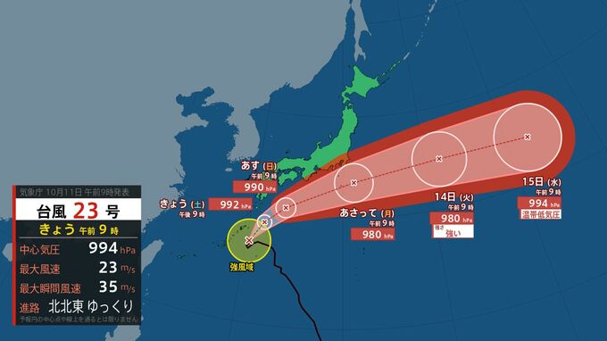 気象庁によりますと、台風第23号は、きょう(11日)午前9時には奄美大島の南南東約160キロにあって、ゆっくりした速さで北北東へ進んでいます。