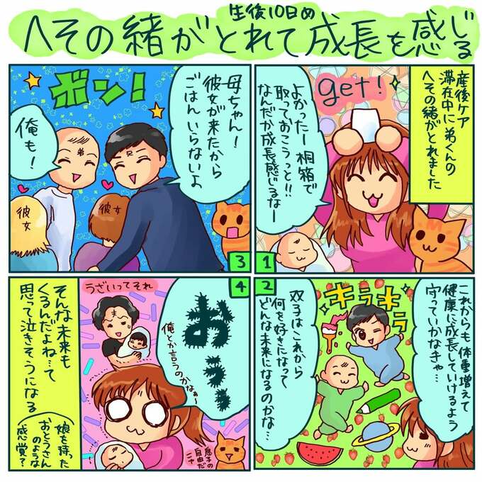 さらに「へその緒が取れて成長を感じる」というページでは、双子の成長を期待しつつ「母ちゃん!彼女が来たからごはんいらないよ」という双子男子を描いて、早すぎる不安を妄想しています。