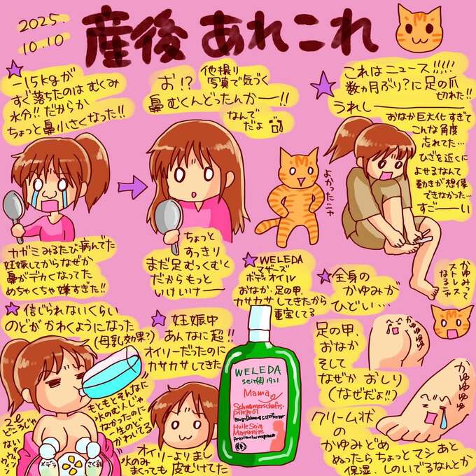そして「たのしいことしあわせなことびっくりなこと」「生きた証をこれからも残していけたらいいな」との言葉通り、2ページの絵日記を投稿。「産後あれこれ」という題のページでは「-15kg」でむくみが「ちょっとすっきり」や「信じられないくらいのどがかわく」など、体調の変化を伝えています。