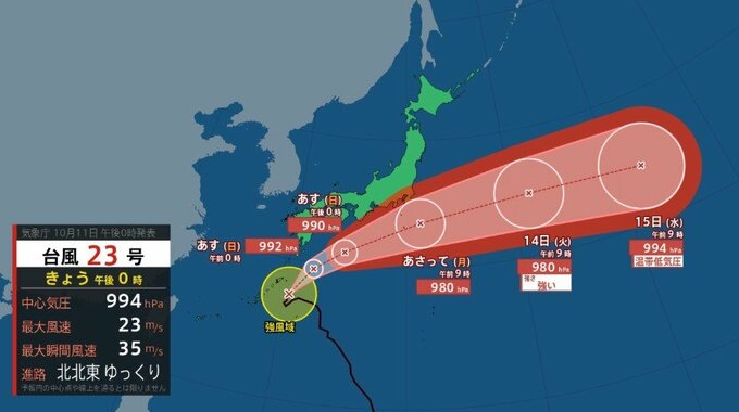 気象庁によりますと、台風23号は、11日正午には、奄美大島の南東約140キロにあって、ゆっくりした速さで北北東へ進んでいます。中心の気圧は994ヘクトパスカル、中心付近の最大風速は23メートル、最大瞬間風速は35メートルで中心から半径220キロ以内では風速15メートル以上の強い風が吹いています。
