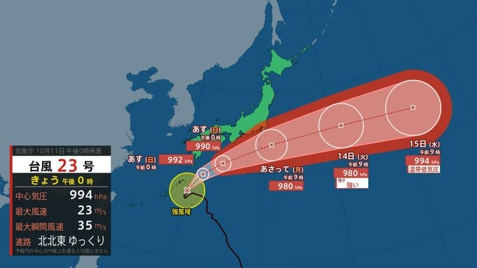 気象庁によりますと、台風第23号は、きょう(11日)正午には奄美大島の南東約140キロにあって、ゆっくりした速さで北北東へ進んでいます。