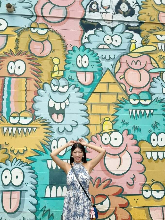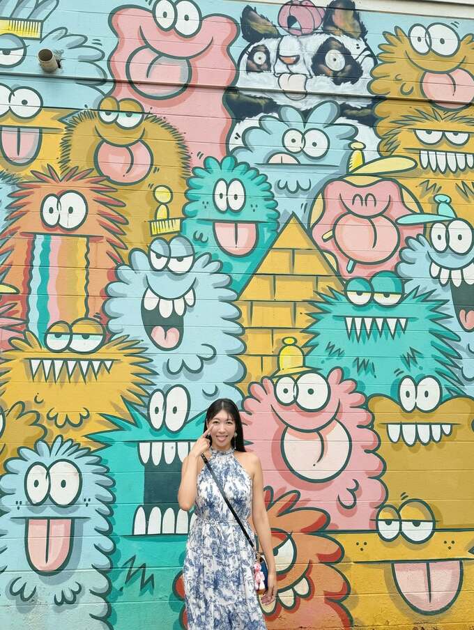 色とりどりの大きなモンスターたちが何匹も壁いっぱいに押し寄せて目を見開いたり舌を出したり変顔を見せている中、穂川さんは良く見ないとわからないくらいモンスターたちの間にまぎれていて、変顔を真似するように笑顔で舌を出しています。