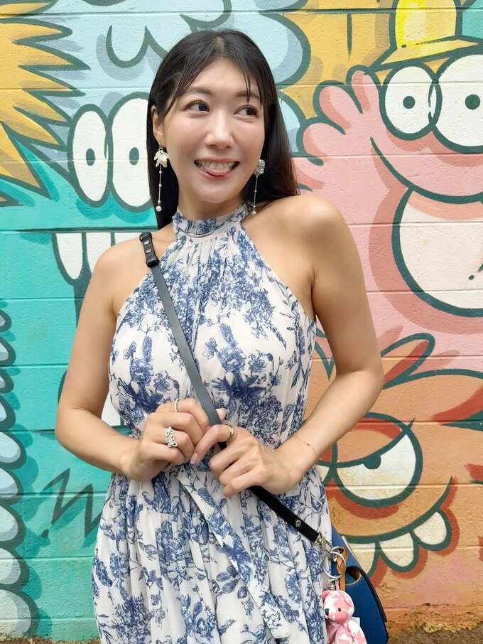 そんな穂川さんは、ホルターネックでオフショルダーの、白地に青の草花のパターンがプリントされたワンピースドレスを着てポシェットを下げ、得意の肩出しスタイルで開放感を伝えています。