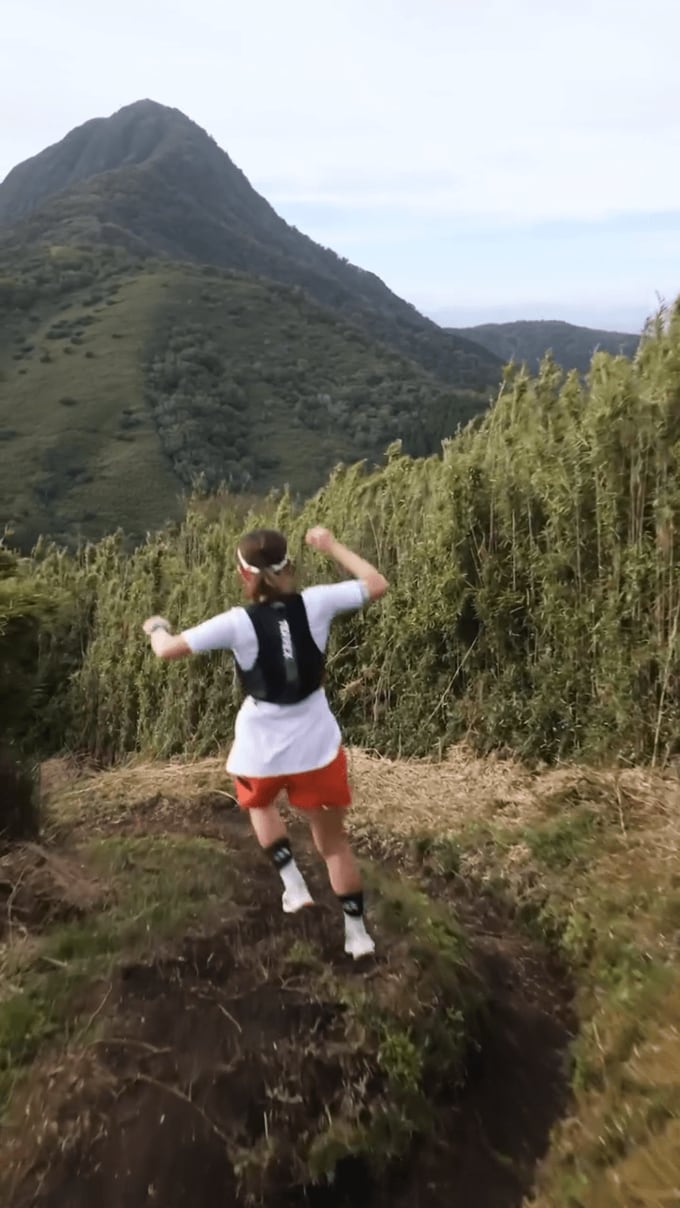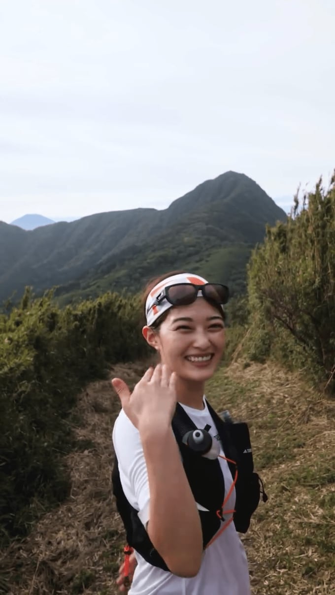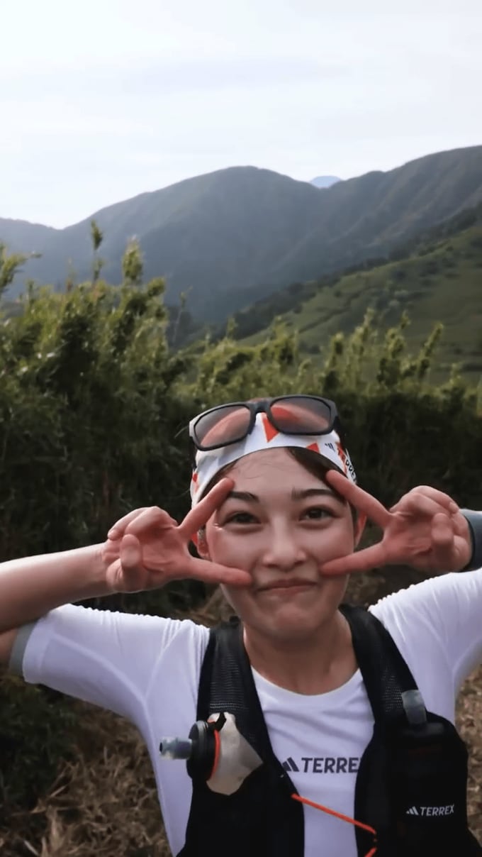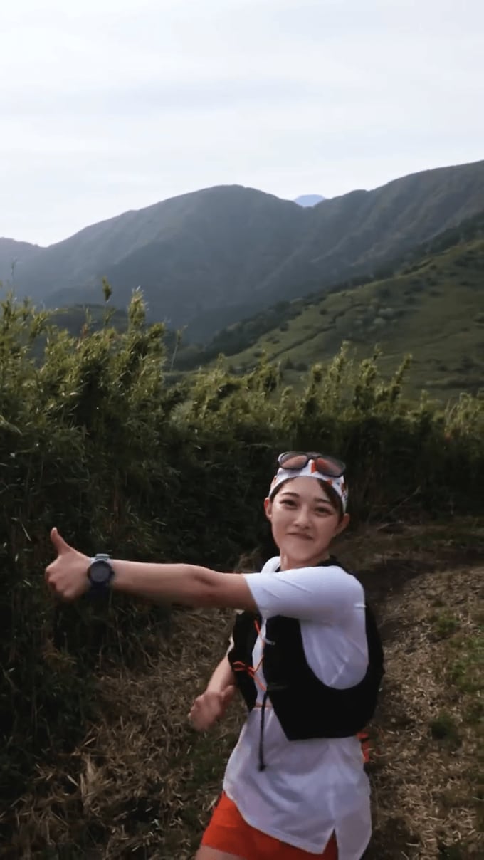 田中さんの声かけでストップした井上さんは振り返り、両手でピースサインを出してポーズ。さらにサムアップを突きだしてヒーローのようなポーズを取るなど、山道ランを心から楽しんでいる様子。