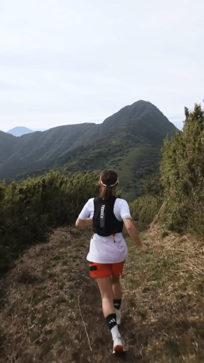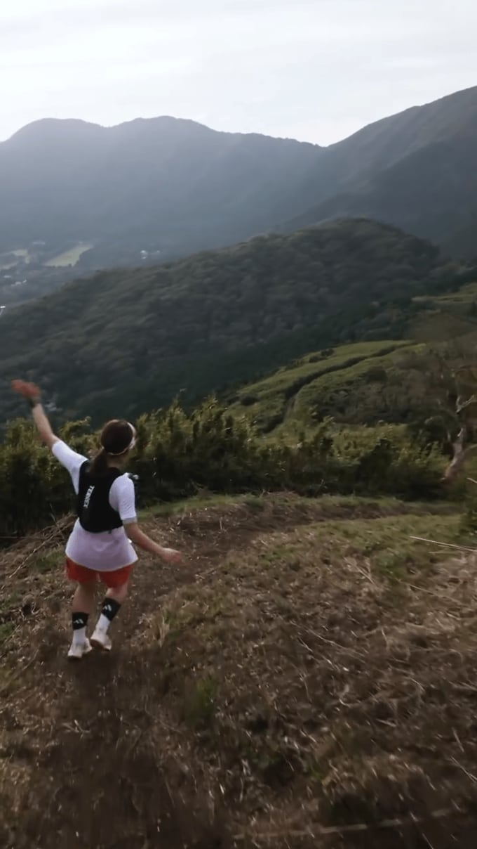 遠くに山の頂が見える山道に佇む井上さんは、伴走者で今回のカメラを担う田中嵐洋さんの「せーの」という声に合わせて振り向いて、手招き。投稿でテキストしている「ごきげんな音楽」に合わせて、軽やかに走り出します。