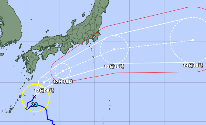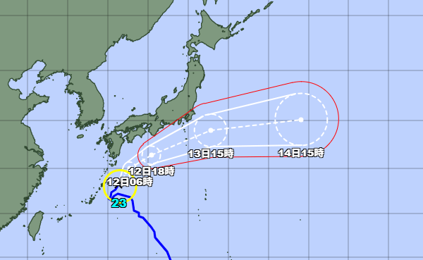 台風は発達しながら、12日にかけて日本の南から東海道沖を東北東へ進み、13日には暴風域を伴って、台風第22号と同じように伊豆諸島にかなり接近するおそれがあります。