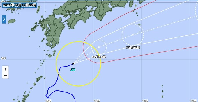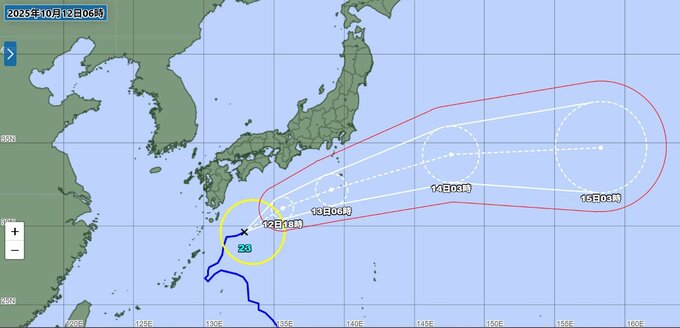 台風の予報進路は、予報の期間が長くなるほど誤差の幅(予報円)が大きくなります。最新の情報を確認するようにしてください。