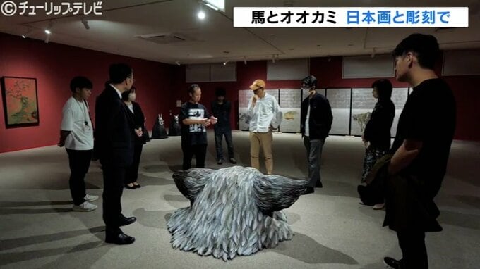 今回は、いずれも上市高校出身の、彫刻の清河北斗さんと日本画の平井千香子さんが、馬とオオカミをテーマに、平面と立体でコラボレーション、ひとつの空間を作り上げています。