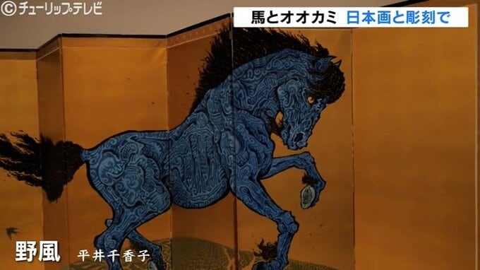 平井さんは、屏風に広大な大地を駆けていくたくましい古来の馬を表現。清河さんは、まるで大地に溶けていくような不思議なオオカミの新作を今回の作品展のために作りました。