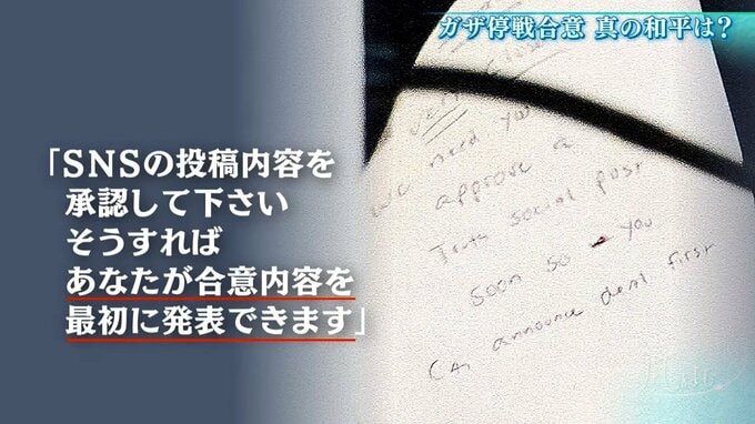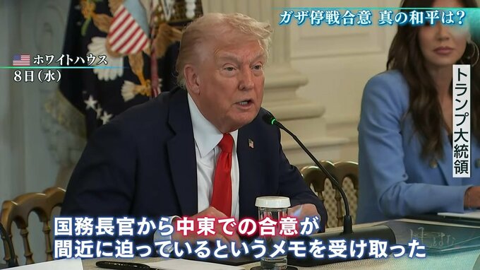 この約2時間後、トランプ氏はイスラエルとハマスが「ガザでの戦闘停止」や「ハマスによる人質解放」、「イスラエル軍が合意された境界まで撤退すること」など和平計画の第1段階に合意したと発表。