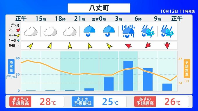 【台風情報】「台風23号」伊豆諸島は警戒を 全国各地の天気への影響は?今後の進路は?【気象庁 12日午後2時30分更新】 RSK山陽放送 2025年10月12日(日) 14:30 国内 当該エリアの24時間の予報は? 当該エリアの今後24時間の天気予報は、【画像㊻~】の通りです。 【画像㊻】 【画像㊼】 【画像㊽】 今後の気象情報に注意してください。